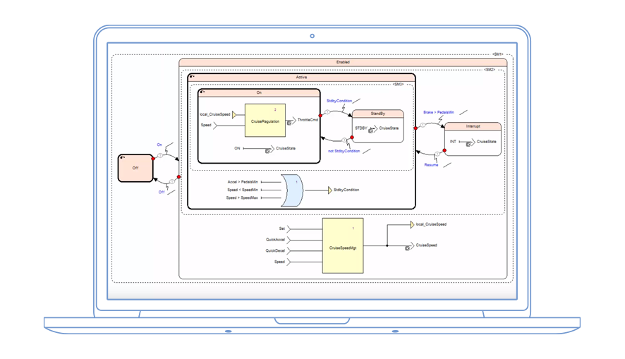 Ansys SCADE Suite позволяет отработать и отладить логику процессов с наглядным графическим представлением, работать совместно с Ansys TwinBuilder и сторонним ПО, таким как Simulink и MATLAB, а также создавать человеко-машинные интерфейсы.