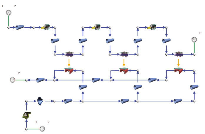 Flownex SE позволяет моделировать течения используя одномерный (1D) CFD решатель, создавать и калибровать системные модели объектов при построении цифровых двойников, применяемых во время эксплуатации объекта.