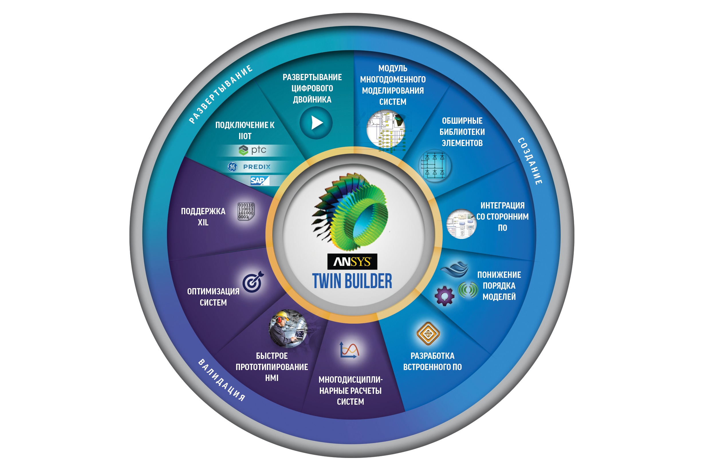 Ansys Twin Builder позволяет моделировать многодоменные системы с учетом взаимодействия между внутренними компонентами, элементами управления и окружающей средой, а также создавать, проводить валидацию и осуществлять развертывание цифровых двойников в среде промышленного интернета вещей.